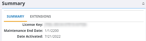 The Summary panel has two tabs: the Summary and Extensions tabs. The Summary tab lists your License Key, the Maintenance End Date, and the Date Activated.