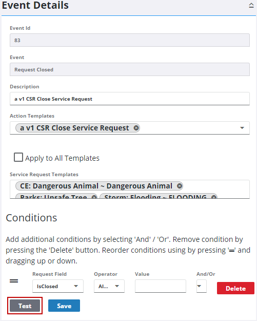 You can test if your message queue service is set up correctly before triggering webhooks. This inserts a test object patterned after the event configured to test if the message queue service is processing the event data, but it does not actually test to see if the event is set up correctly.