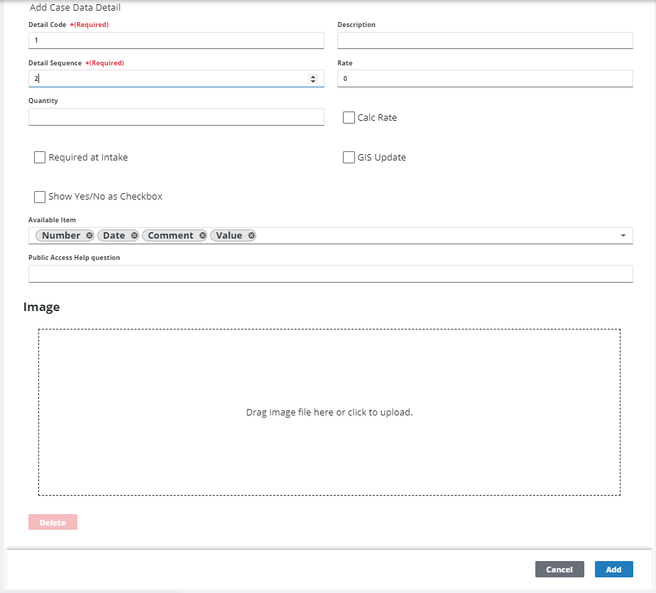 - In the Add Case Data Detail section, enter a code (10 characters maximum).