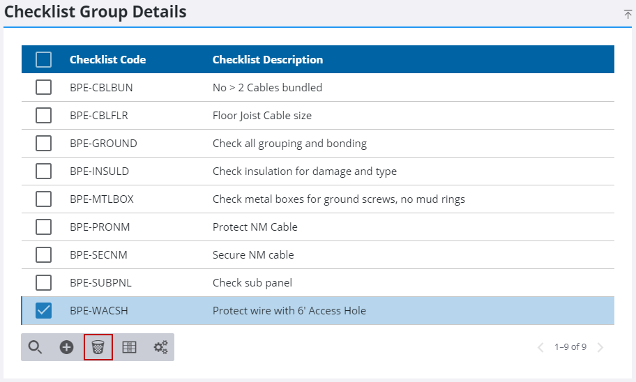 - On the Checklist Group Details panel, select a checklist and click Delete selected records to delete any desired checklists.