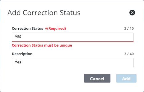 - On the Add Correction Status panel, update the name in the Correction Status field (10-character maximum).