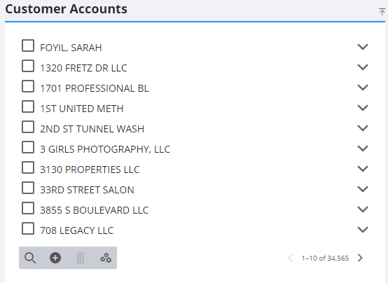 Existing customer accounts are shown in the Customer Accounts panel. You can filter the list by typing the first few letters of the customer name or the first few digits of the account number in the search box.