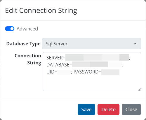 TIP: You can also select the Advanced option and enter the Server, Database, User, and Password in a string instead of using the fields.