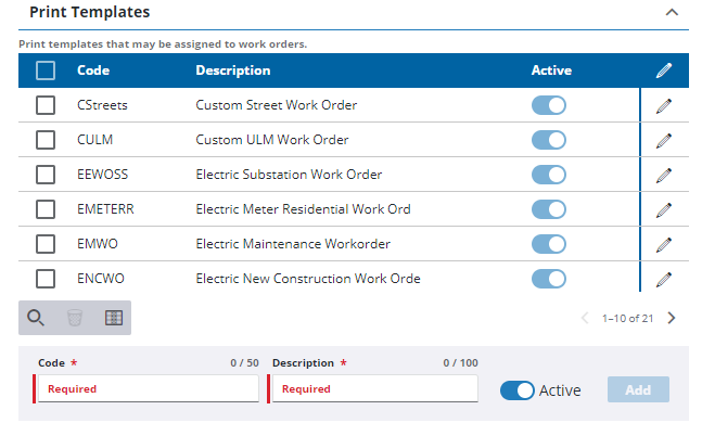 - For existing print templates, turn off Active to make the template inactive, but maintain historical data associated with it.