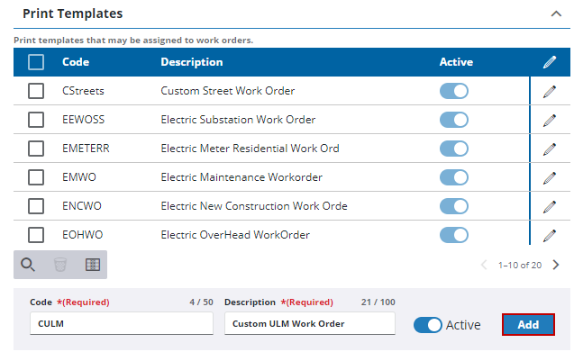ActiveReports or Word Print Templates can be added to print work orders in Respond. When an active report is saved in Respond, it's automatically registered as an available print template for the corresponding activity type in Preferences and does not need to be manually added here. If a report is added to the site files, it needs to be added here as well for it to be available for work orders.