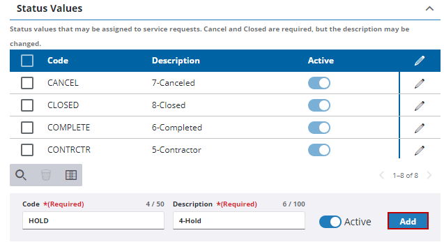 - For existing status values, turn off Active to make the code inactive, but maintain historical data associated with it.
