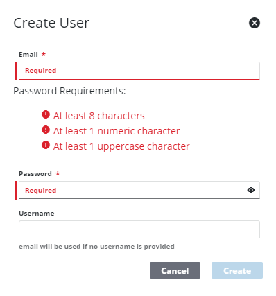 If any password requirements have been set by the administrator, the user sees all of the requirements they must meet while creating a password, as well as an X or a green check mark to indicate whether or not the password is acceptable. You cannot click Create until the password meets the requirements set by the administrator. See Configure Global Preferences for more information.