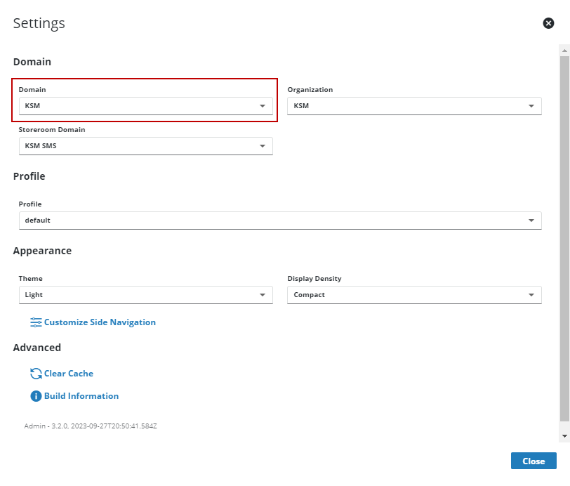 2. Click the Domain, Organization, or Storeroom Domain drop-down lists and select the domain or organization you want to work in.