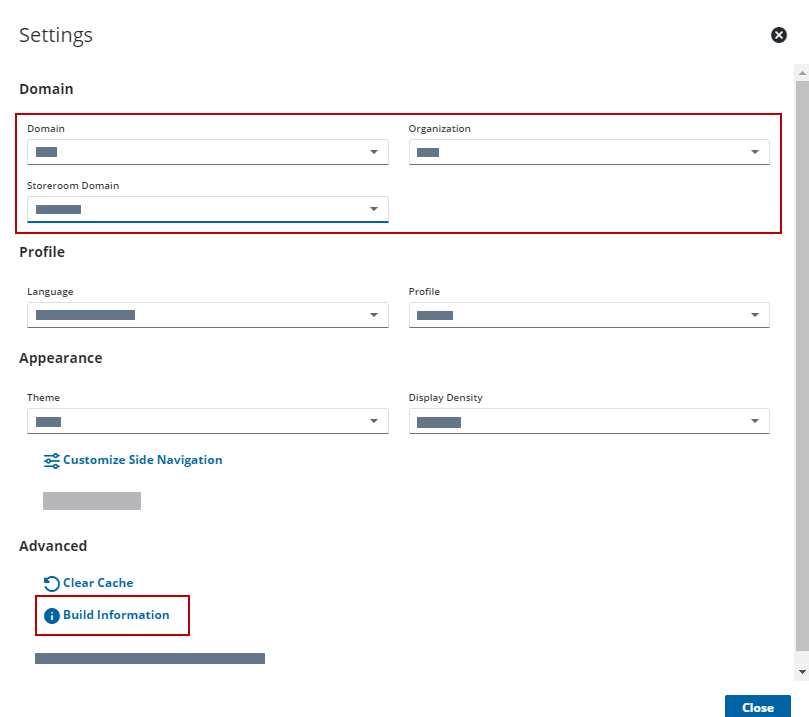 You can view the domain, organization, and storeroom domain you are a part of. You can view additional version information regarding the plugin.