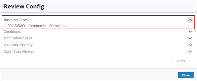 The Review Config panel provides visibility of where a selected data item (such as a case type, PLL user, status code, etc.) is being used. The steps below outline how to access this visibility for case types, and this same approach is applicable to all PLL items that include the Review Config icon.