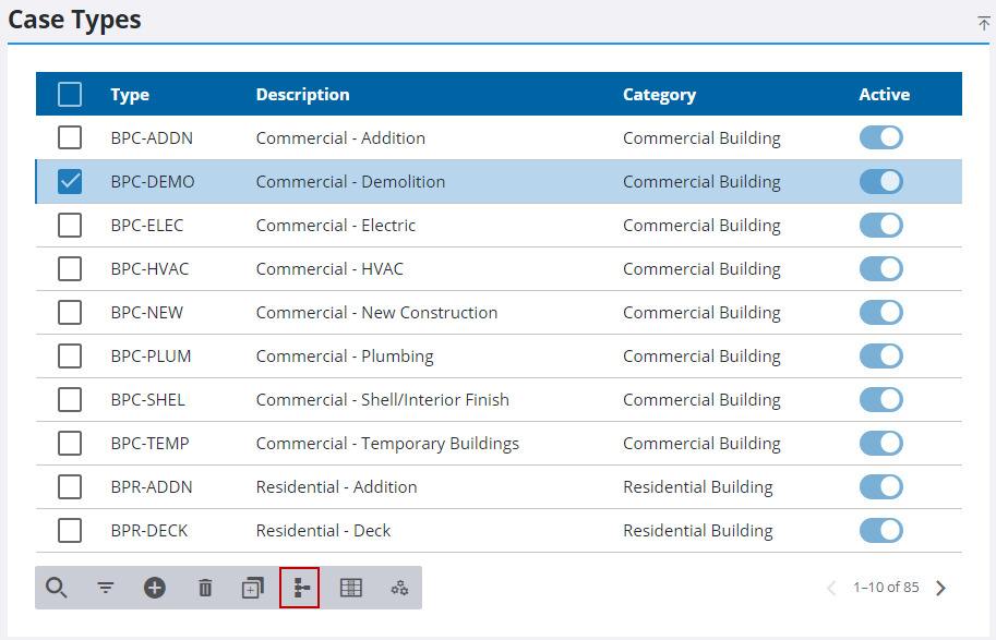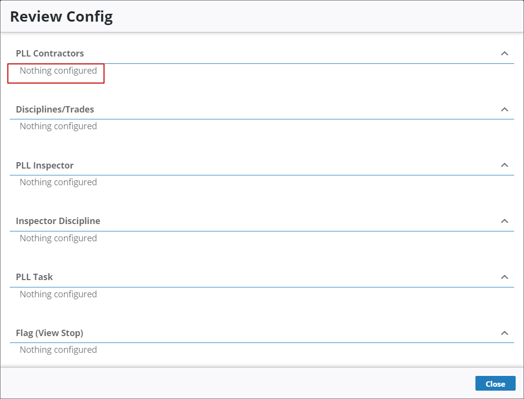 - On the Case Types panel (or other desired PLL panel), click the case type (or other desired PLL data item) that you want to review the configuration for, and click Review Config.