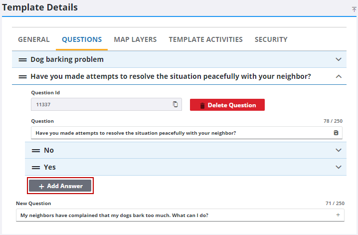 - Click Add Answer to add an answer to the selected question.