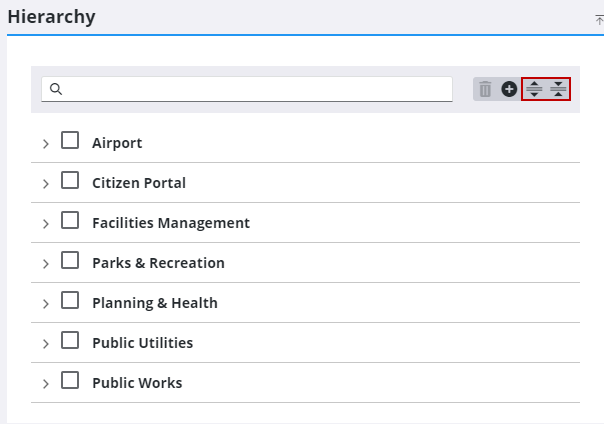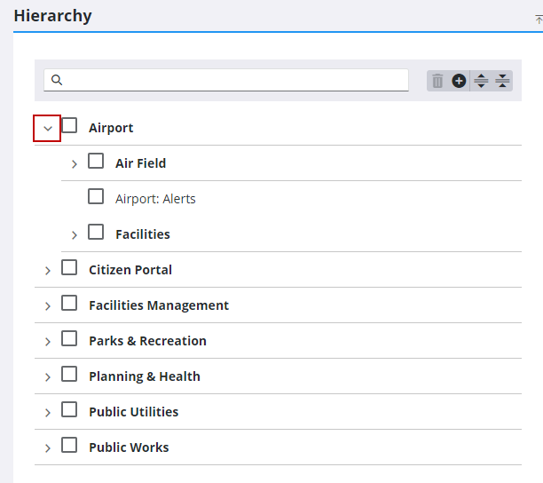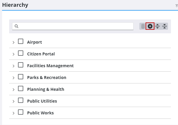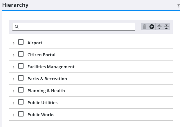 The Hierarchy panel is used to organize the service requests into groups to make them easy to find when creating a new service request. A service request can reside within more than one group.