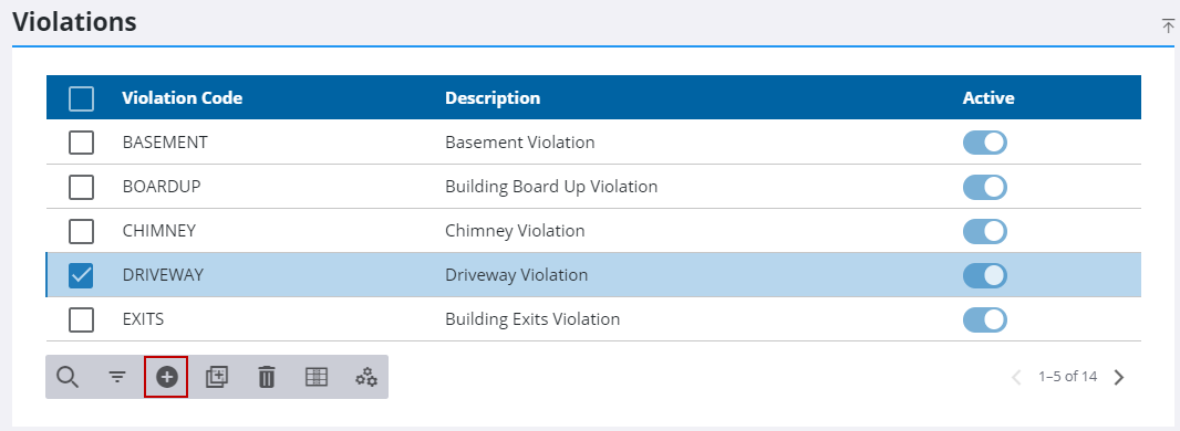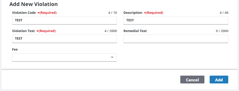 - On the Add New Violation panel, fill in the Violation Code field, the Description field, the Violation Text field, the Remedial Text field, and make a selection in the Fee drop-down list.