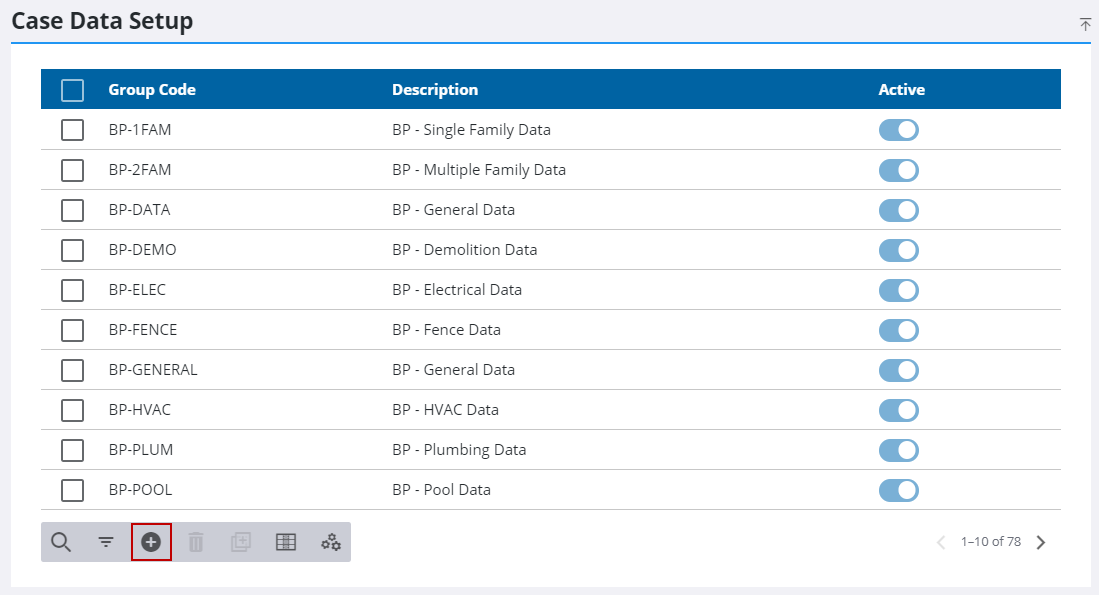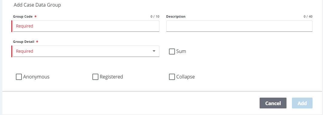 - In the Add Case Data Group section, enter a code in the Group Code field. This code will appear in drop-down lists and is limited to 10 characters.