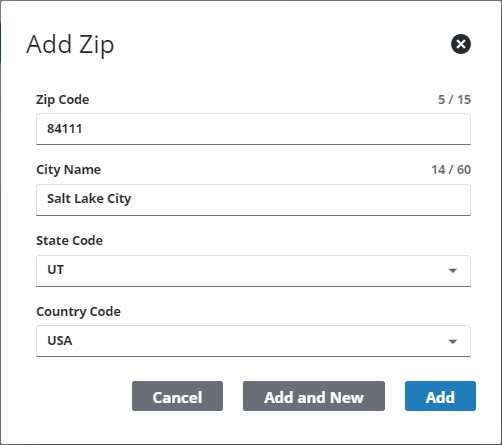 - Click Add or Add and New to add the zip code and create another one.