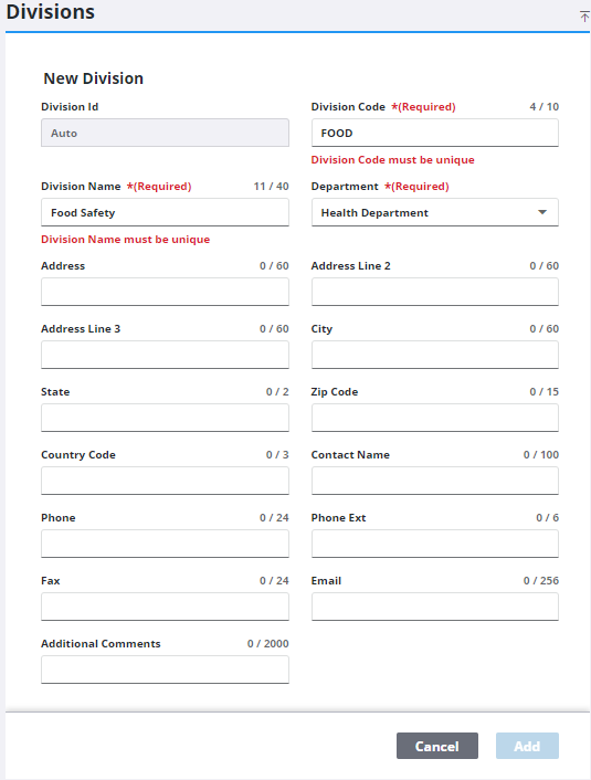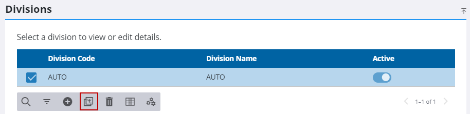 - Enter a unique Division Code and Division Name for the new division record. Make sure to change any of the other information if necessary.