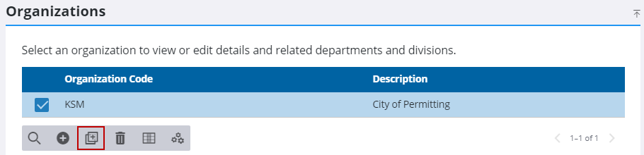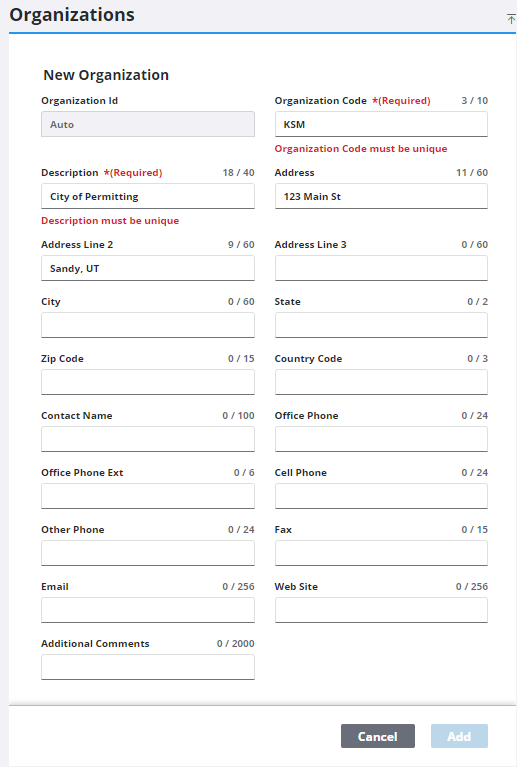 - On the organization panel, enter a unique Organization Code and Description for the new organization record. Make sure to change any of the other information if necessary.