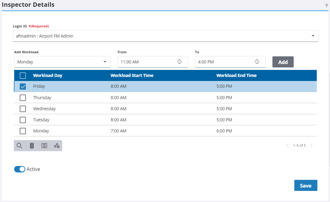 - To set the inspector's workload, select a day of the week from the Add Workload drop-down list.
