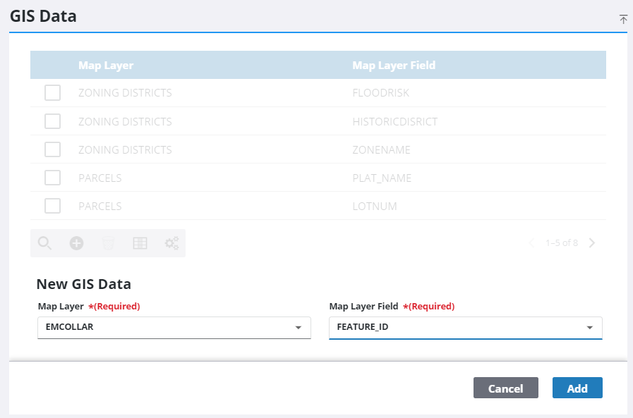 You can use map layers to display specific information from a map layer on a case's Summary page. For example, by selecting the PARCELS map layer and the OWNER_NAME field, you can make the name of the parcel owner appear on the Summary page of a case.