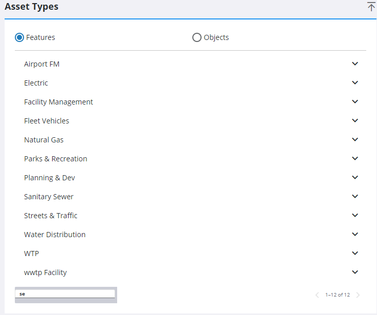 - Select Features or Objects, expand the asset group and then select the asset type. You can filter the list by clicking Filter records and typing the first few letters of the feature or object.