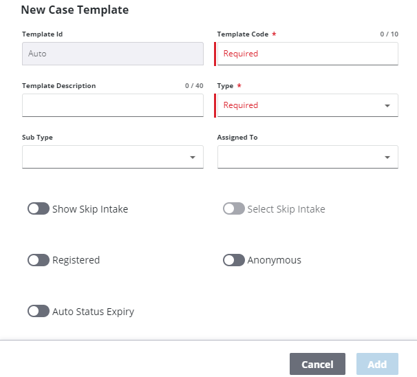 - In the New Case Template section, enter a code in the Template Code field. This code will appear in drop-down lists and is limited to 10 characters.