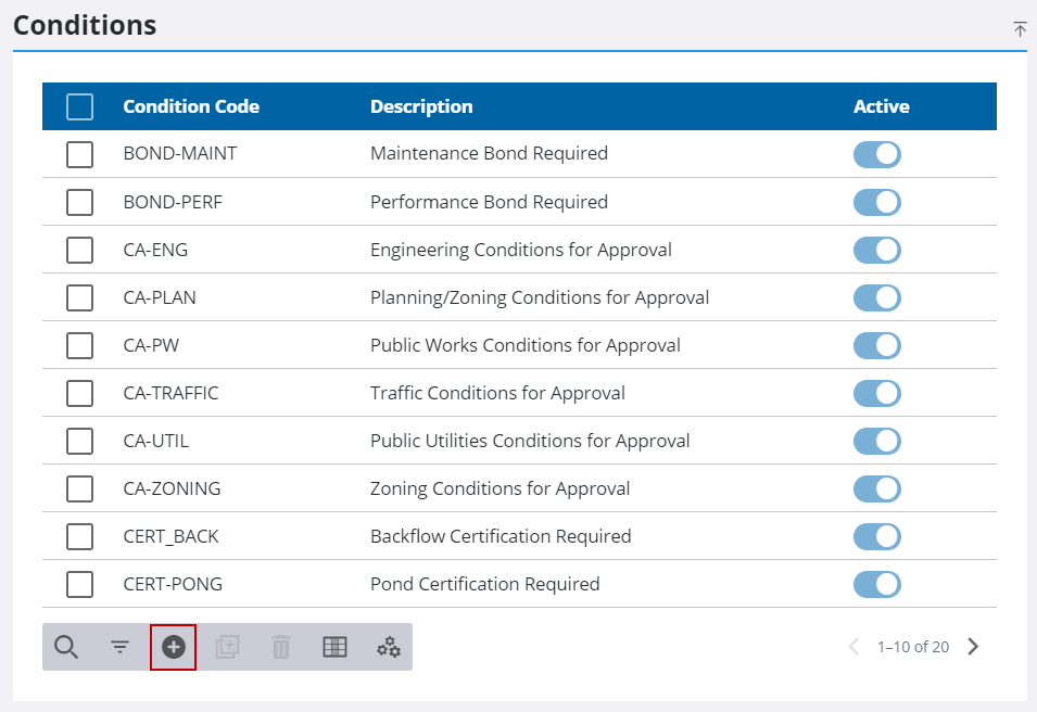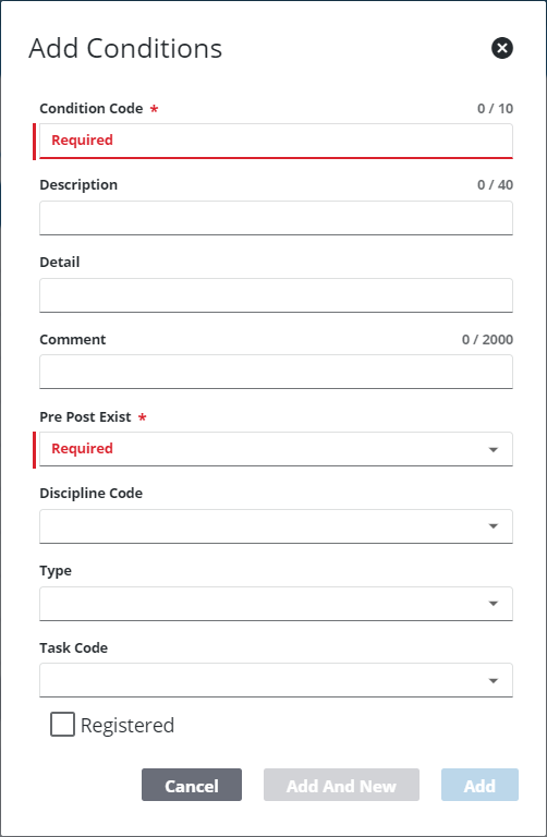 - On the Add Conditions panel, enter a name in the Condition Code field, make a selection in the Pre Post Exist drop-down list, and populate the other fields as desired.