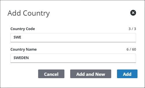 - Click Add or Add and New to add the country and add another one.