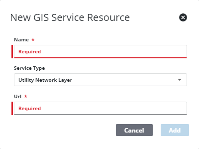 - Enter the URL of the service. The URL is a combination of two URLs from an Esri Utility Network GIS service. First, copy the URL of the Utility Network service (ending in /UtilityNetworkServer), then locate the layer ID of the utility network layer in the FeatureService in the same folder of the ArcGIS Services Directory. Copy the layer ID from the URL and add it to the base URL (for example, .../UtilityNetworkServer/12).