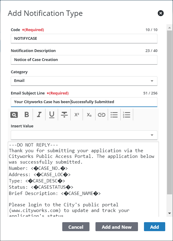 The Insert Value placeholders are dynamically populated with case-relevant data when a message is sent.