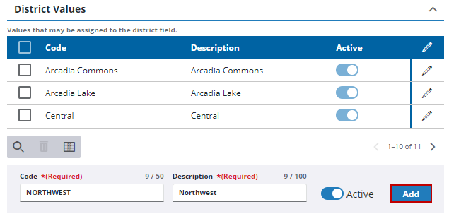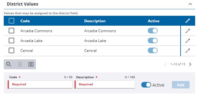 - For existing district values, turn off Active to make the code inactive, but maintain historical data associated with it.