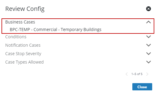 The Review Config panel provides visibility of where a selected data item (such as a case type, PLL user, status code, etc.) is being used. The steps below outline how to access this visibility for case types, and this same approach is applicable to all PLL items that include the Review Config icon.