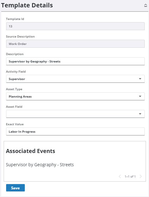 - Select the Asset Type and Asset Field to determine which GIS asset and asset attribute populates the field. The Asset Field drop-down list is filtered by the Activity Field chosen.