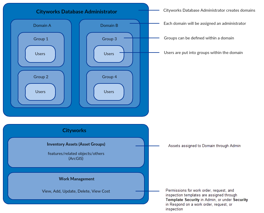 For more a more in-depth analysis on domains, groups, and individual permissions or securities that need to be assigned and where they can be configured in Cityworks, continue reading: