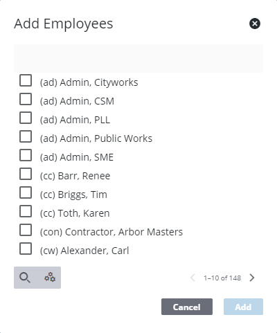 In the Add Employee panel you can filter the list by typing the first few letters of the employee name in the search box at the top.