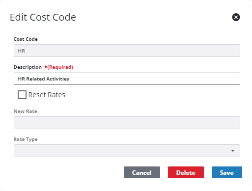 - To delete a cost code, click the edit icon and click Delete on the Edit Cost Code panel.