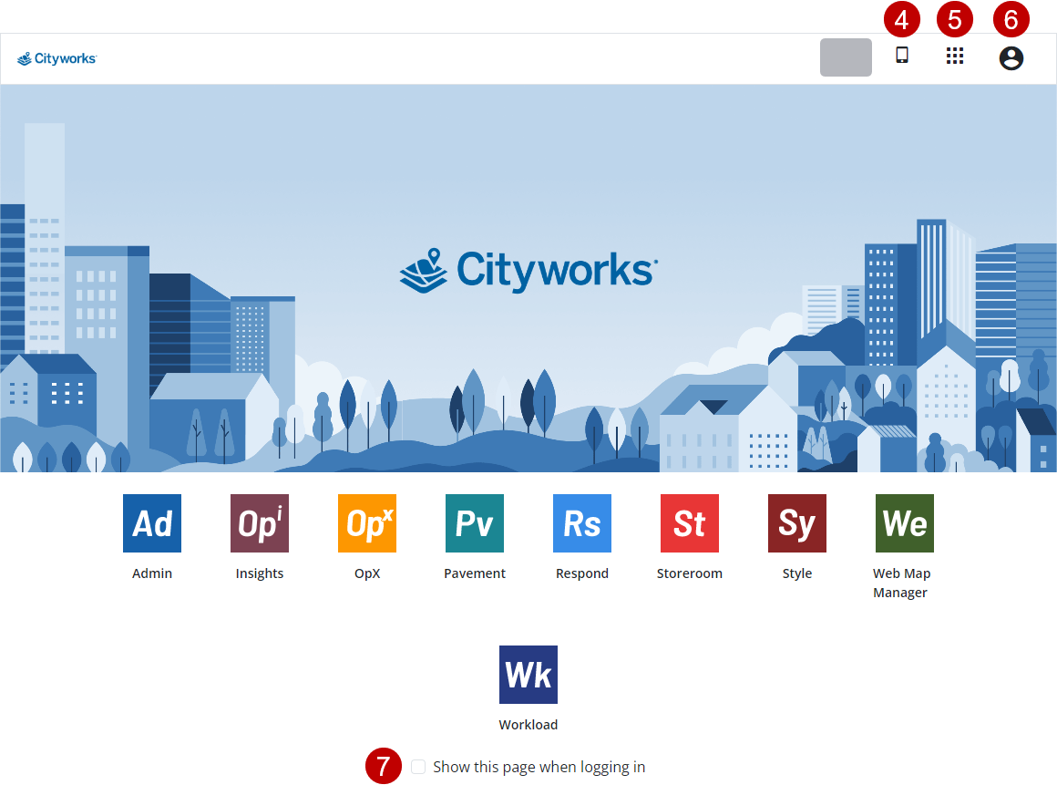 4. Click the profile icon to view Cityworks version and host information, as well as to log out.
