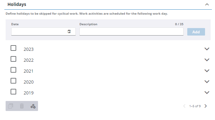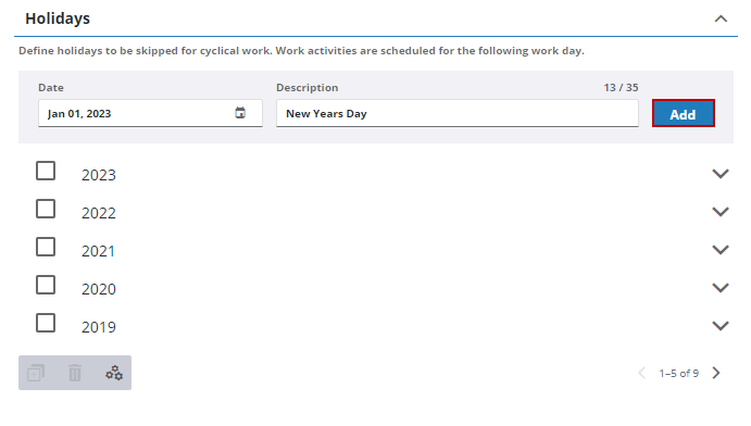 Add Holidays observed by your organization to avoid having cyclical work orders start on a holiday. Work orders are scheduled to start on the first work day following the holiday. Holiday schedules are defined by domain and are applicable to AMS and PLL. The holidays entered here are grouped by year.