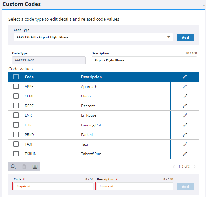 - Select an existing Code Type to view the code values.