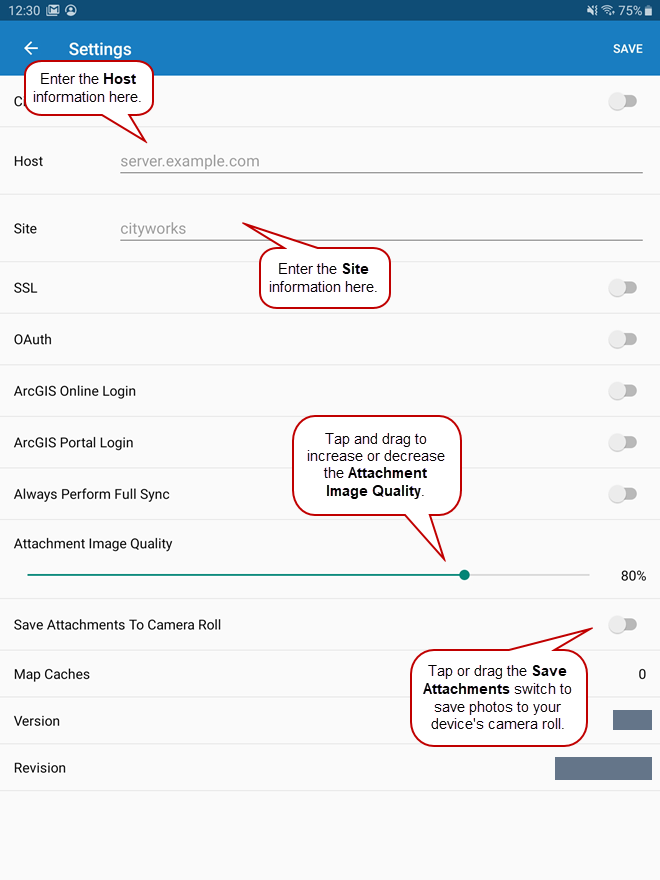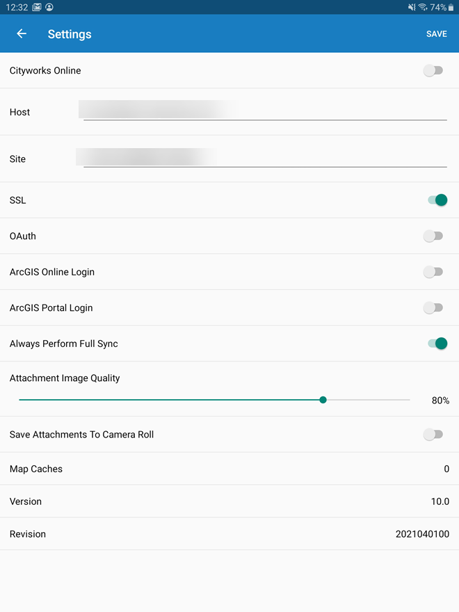 1. Tap or drag the ArcGIS Portal Login switch to the right if you are using Portal for ArcGIS credentials to log in to the app. Talk to your Cityworks Administrator to get the following Portal for ArcGIS information.