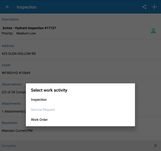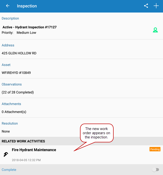 IMPORTANT: Make all desired changes to the new work order before syncing your device, as it does not appear in the app unless the work order meets the filter criteria to appear in your inbox or is included on a saved search that has been added to your mobile inbox. See Filter Criteria and Add Saved Searches to the Mobile Inbox in the Designer for 15.7 Guide for more information.