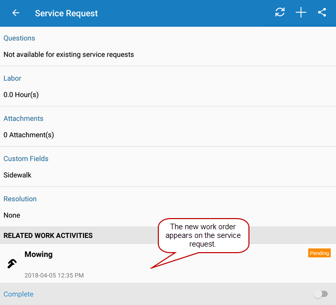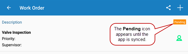 When a work order is created, a Pending icon appears on the work order until you sync the app. The next time you sync the app, the icon will disappear and the work order will be synced with the main system.