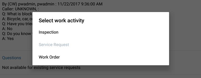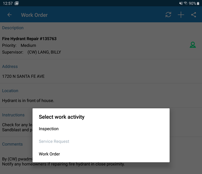 - Tap the add icon in the upper-right corner and tap Work Order on the Select work activity window.