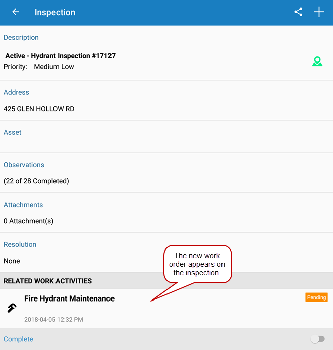 Once the work order is created, it appears at the bottom of the inspection in the Related Work Activities section.