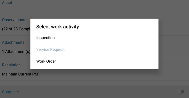 Unattached work orders are not associated to an asset and can be created while working offline. It is recommended that all unattached work orders are eventually attached to an asset. See Attach an Asset to an Existing Work Order for more information.