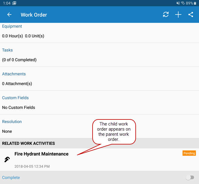 - Tap the add icon in the upper-right corner and tap Work Order on the Select work activity window to create a child work order.