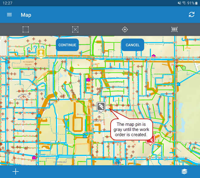 NOTE: The map pin changes to a red color to indicate that the work order has been created. The next time you sync the app, the work order will be synced with the main system.