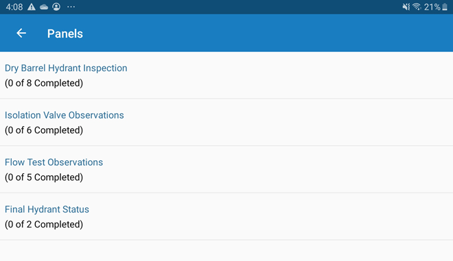 NOTE: The Observations panels differ from one inspection to another, and do not look exactly like the example provided. If the inspection template is configured to display observations in multiple panels, the panels appear on this screen. The panels are collapsed by default, but you can tap them to expand them.