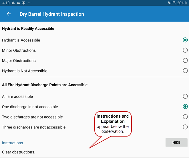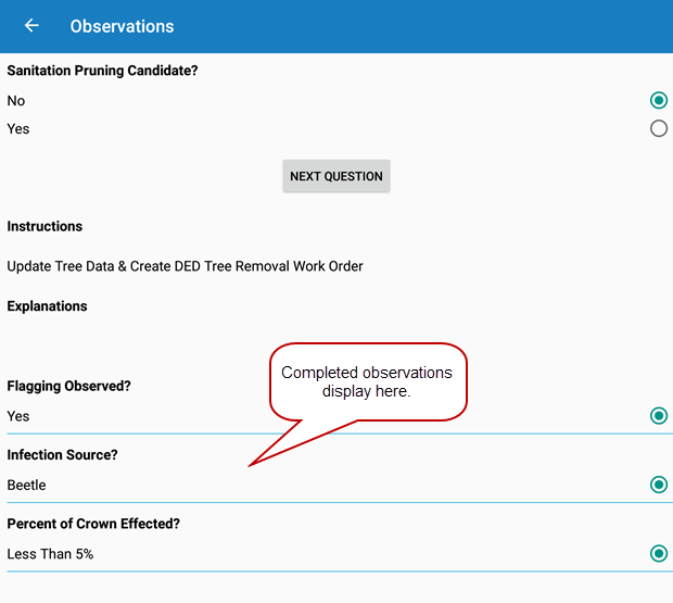 If there are instructions or an explanation configured for the answer selected, they appear at the bottom of the observation.