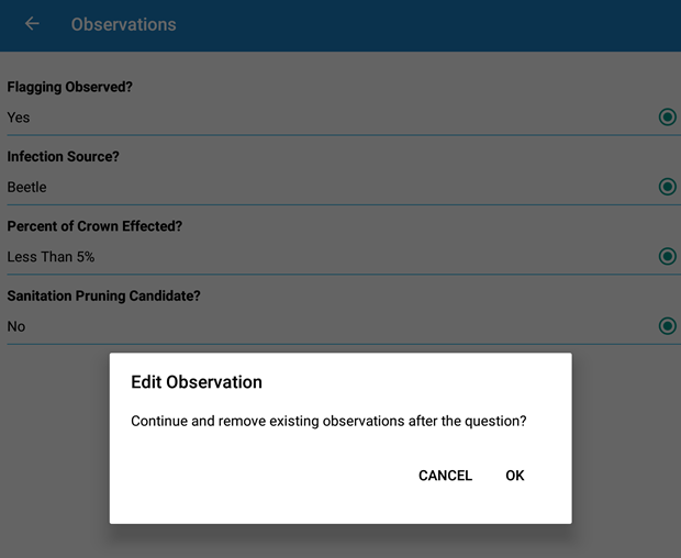 - To edit an observation, tap an observation and tap Yes on the Edit Observation window. Existing observations below the one being edited are removed, and the observations will need to be completed once more.